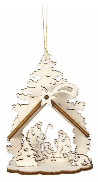 Mehrteiliger Aufhänger zum Zusammenstecken: Kleine Krippe au s Natur-Holz, gefertigt in einem Traditionsbetrieb für Holzs chnitzkunst im Grödnertal (Südtirol), ca. 9 cm, mit Band zum Aufhängen, im Beutel verpackt. Ideal auch zum Verschicken!